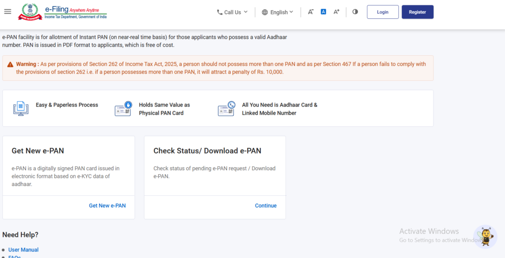 अब यहां पर जैसे कि देख पा रहे हैं की ऑफिशल वेबसाइट जो है गवर्नमेंट का open हो जाएगा अब आपको Instant E-Pan पर क्लिक करना है