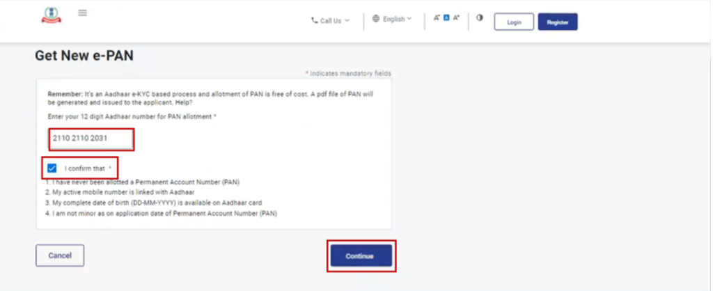 Continue कंटिन्यू करने के बाद ओटीपी वैलिडेशन का फॉर्म खुल के आ जाएगा तो आपको वहां पर ध्यान पूर्वक वहां पर Consent Declaration For Generation of new PAN Based on Aadhaar E-kyc Details: फॉर्म खुल के आएगा आपको उसकी रीड करने के बाद ✅ I have read the consent Terms and agree to proceed further पर क्लिक कर देना है और कंटिन्यू पर क्लिक कर देना है