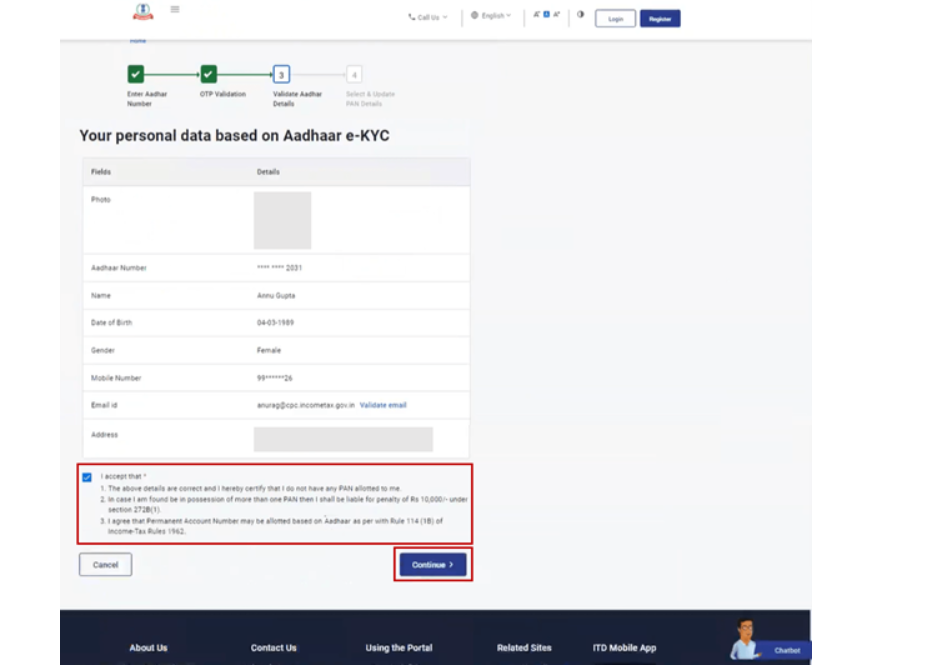 अब आपका आधार से जितने भी डिटेल से है वह ऑटो फिक्स होकर ओटीपी के जरिए से आपका पैन कार्ड बनाने में सहायता करती है और इस डेटाबेस पर आधार ई केवाईसी के थ्रू आपका पैन कार्ड जो है बनेगा जैसे कि कंप्यूटर स्क्रीन पर आधार नंबर नेम डेट ऑफ बर्थडे जेंडर मोबाइल नंबर ईमेल आईडी एड्रेस सारा दिखाई दे रहा होगा