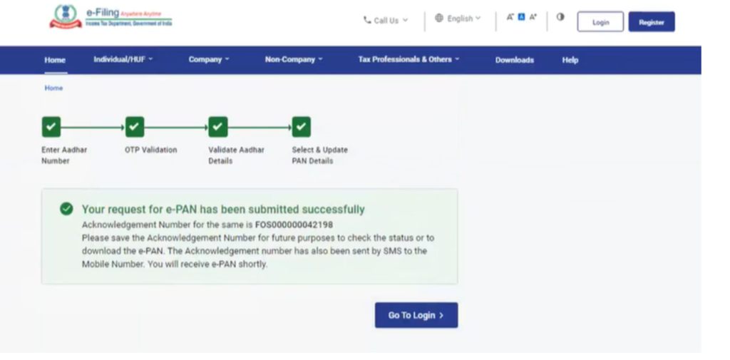 ✅ Your request for e-pan has been submitted successfully अब आपका पैन कार्ड जो है सक्सेसफुल सबमिट हो चुका है अब आप Acknowledgement नंबर जो है इसको Save कर लेंगे और आपके जो है मोबाइल नंबर पर भी SMS के थ्रू भेज दिया जाएगा |