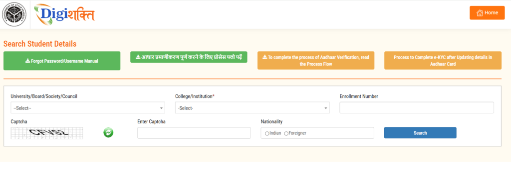 अब आपको University/board/society/council अपना यूनिवर्सिटी डाल देना है फिर दूसरा ऑप्शन सेलेक्ट कॉलेज इंस्टिट्यूट पर आपको अपने इंस्टिट्यूट डाल देना है फिर एनरोलमेंट नंबर डालने के बाद कैप्चर को डालेंगे और नेशनलिटी आपको चूज कर देना है अब Search वाले ऑप्शन पर हम क्लिक कर देंगे |