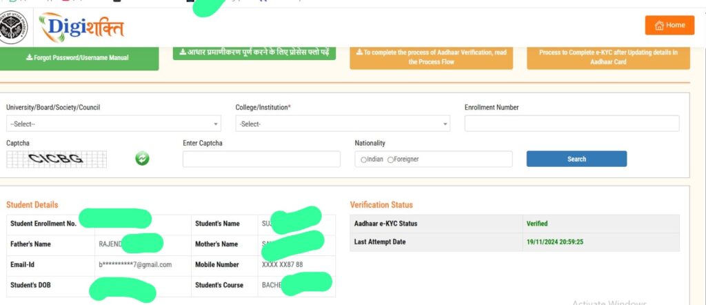 तो अब आपके यहां पर Student Details है खुलकर पूरा आ जाएगा की स्टूडेंट का क्या-क्या डिटेल है जैसे की स्टूडेंट enरो नंबर Father name ईमेल आईडी स्टूडेंट डोप स्टूडेंट नेम मदर नेम मोबाइल नंबर स्टूडेंट कोर्स क्या कोर्स कर रहा है वह आपके यहां पर पूरा इनफार्मेशन देखने को मिल जाएगा अब यहां पर देखेंगे लिखा हुआ वेरीफाई स्टेटस आधार ई केवाईसी स्टेटस यहां पर अगर आपके केस में वेरीफाइड लिखा है तो आप यह समझ लीजिए कि आप जो है तो आप टैबलेट जो है आप उसके योग्य हैं आपका केवाईसी सक्सेसफुल है|